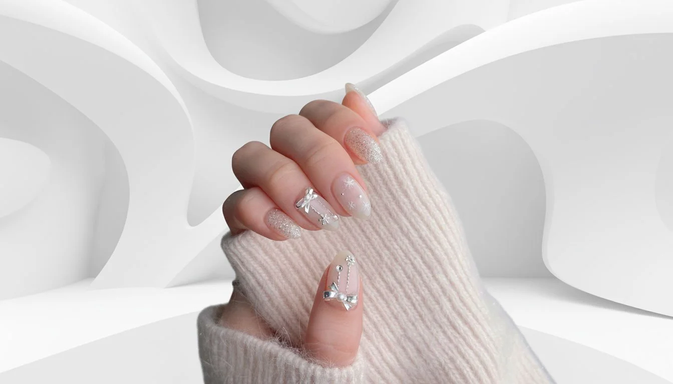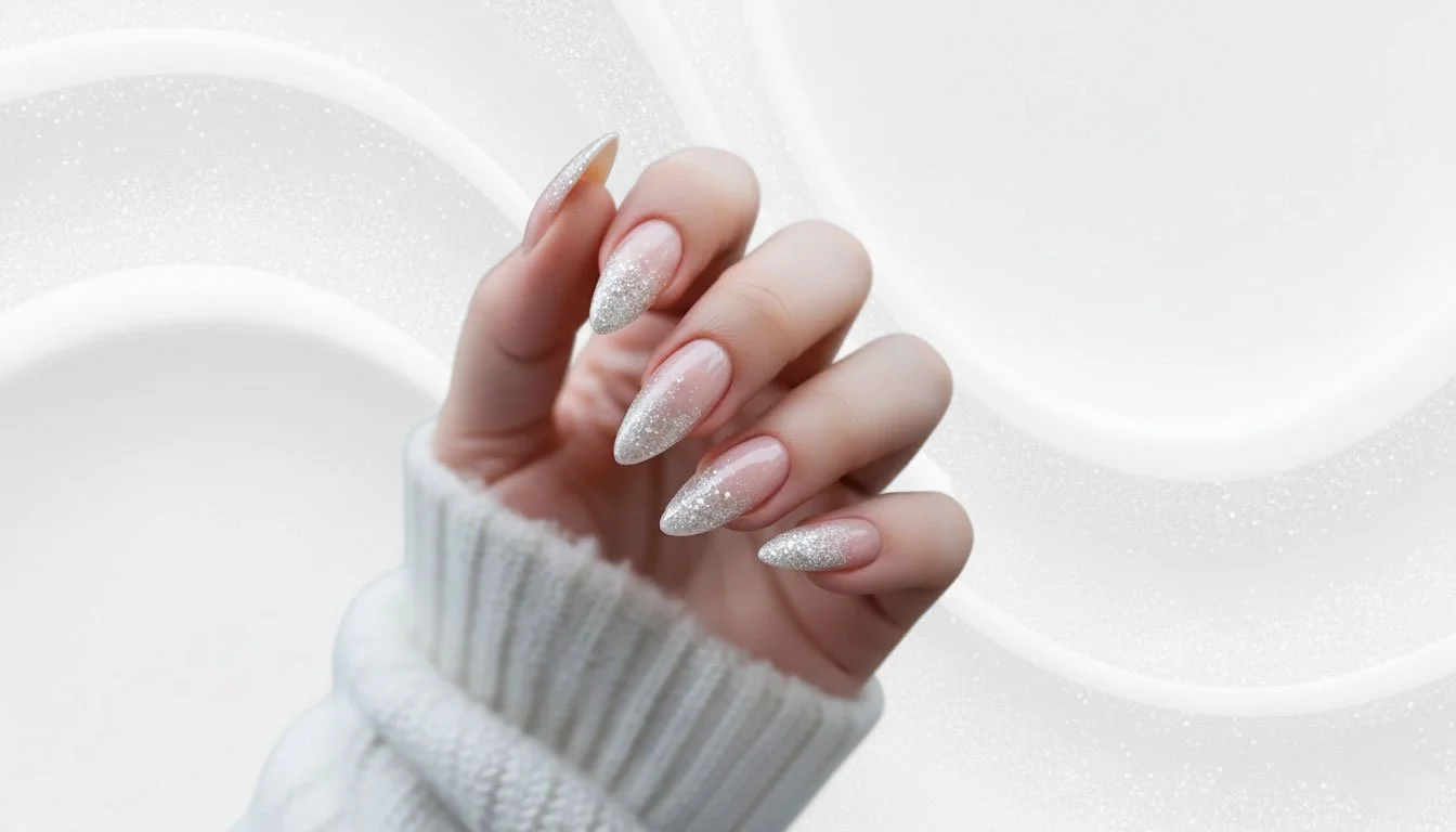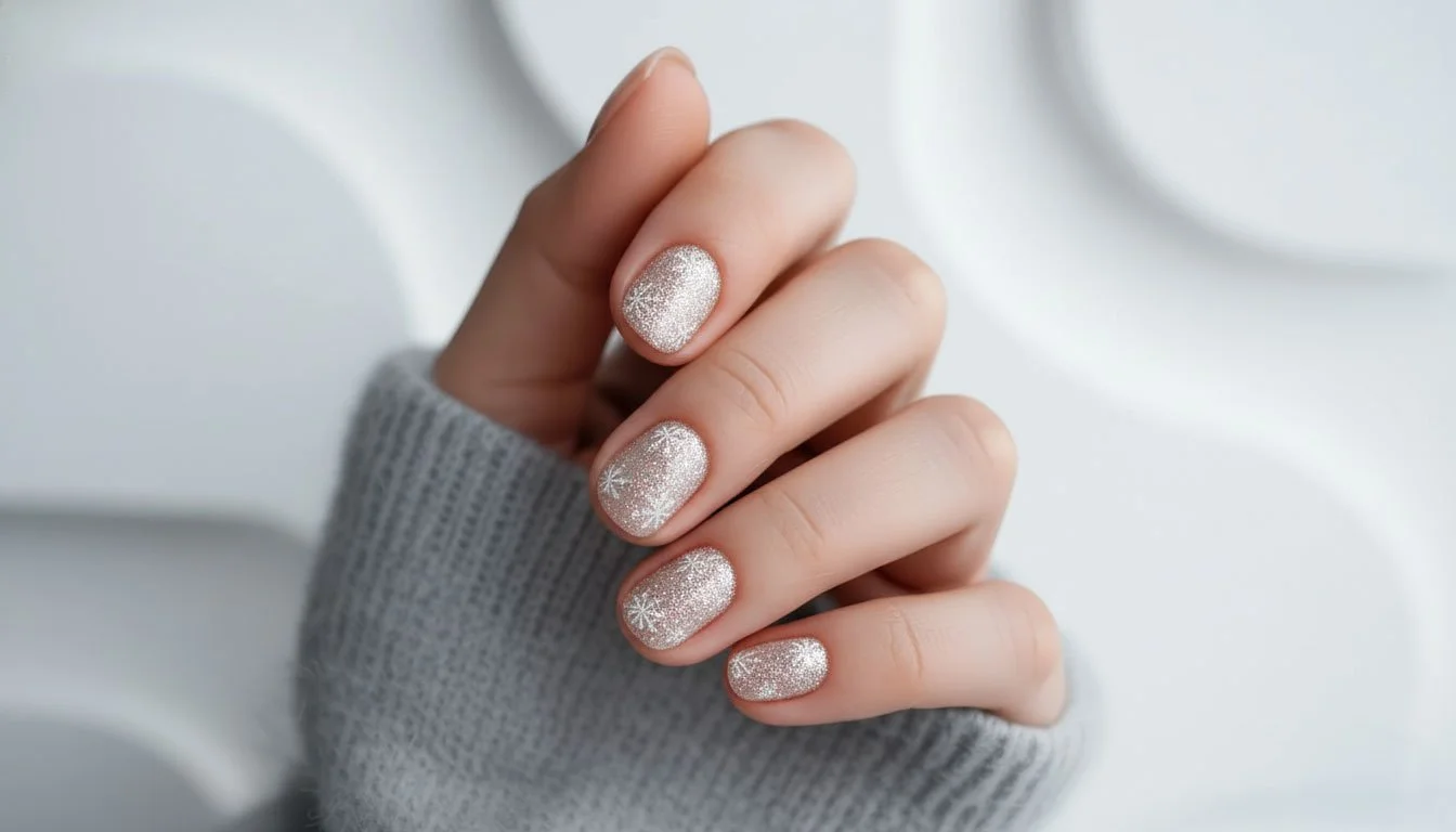 Instead of full glitter nails, this season is all about snowfall accents. Delicate glitter placed at the tips or cascading from the cuticle creates a soft, sparkling snow effect.