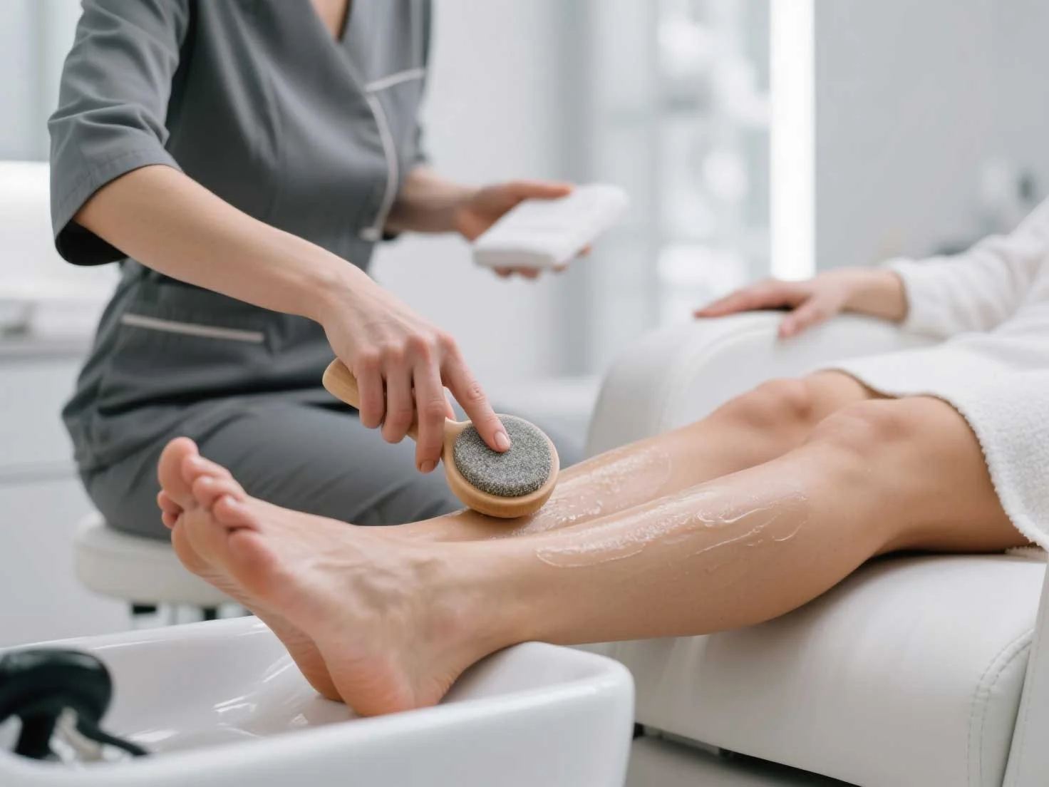 Paraffin Wax Treatment: The warm paraffin wax envelops the feet, deeply moisturizing and improving skin elasticity. The heat increases blood flow, easing muscle tension and enhancing relaxation.